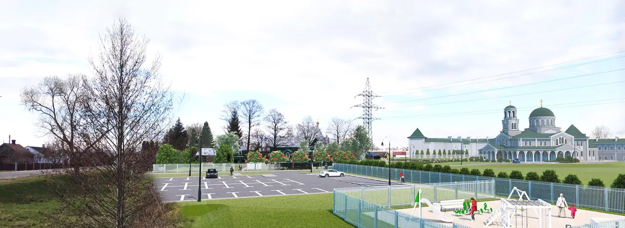 Благоустройство монастырского участка предусматривает устройство детской игровой площадки, пешеходных дорожек и площадок с покрытием из мелкоштучной бетонной плитки, озеленение. Основная парковка для прихожан запроектирована на 45 автомобилей. По периметру территории монастыря планируется установление ограды.